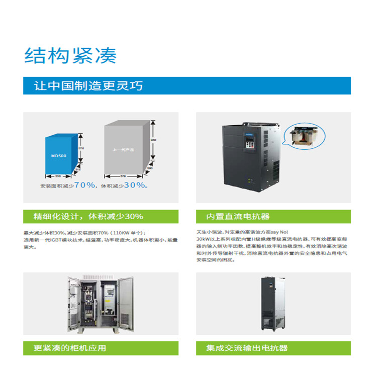 精細化設計,體積減少 30%;完善的直流制動回路方案和長壽命設計;獨立風道設計,可抵抗嚴酷污染環境